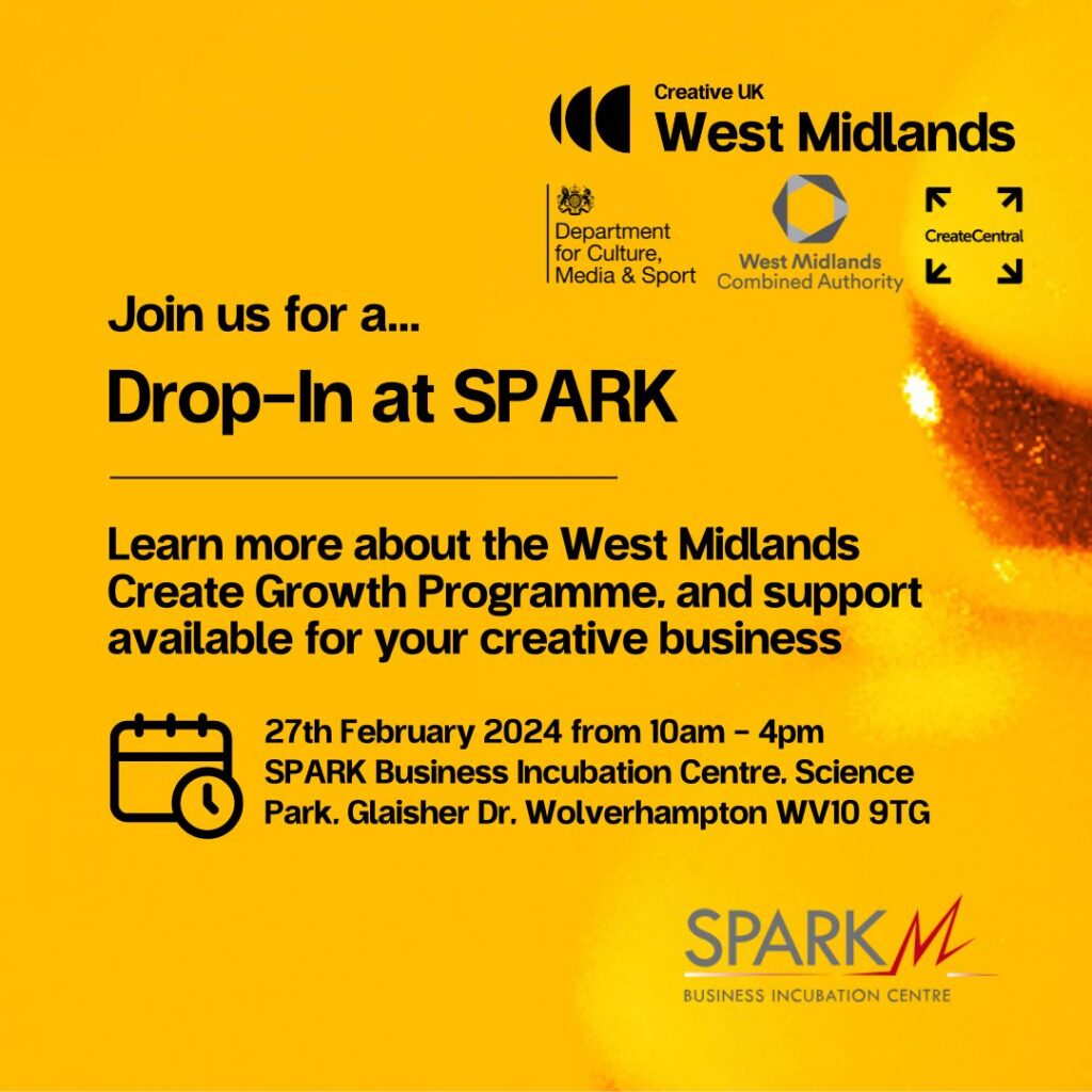 Join us at our drop-in session at SPARK Business Incubation Centre on Tuesday 27th February between 10AM and 4PM to learn more about the West Midlands Create Growth Programme, and how our services could potentially benefit your business. This opportunity offers a wide range of support across a 9-month programme including access to industry experts, tailored advice and guidance, events and networking. So, why not join us at for a coffee and a chat?Join the upcoming drop-in session at SPARK Business Incubation Centre to learn more about the West Midlands Create Growth Programme, and how your business could potentially benefit from their services. This opportunity offers a wide range of support across a 9-month programme including access to industry experts, tailored advice and guidance, events and networking. So, why not join them for a coffee and a chat?